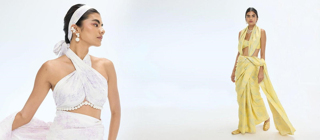 We’re talking butter-soft drapes, sheer organza sarees that are as light as a breeze, and tissue silks that glide over the skin and match the rhythm of your body. The collection features feather-light lehengas, sculptural bralettes, and bandeau blouses—a fresh, au courant spin on French chic with a heart of Indian sensibilities. And to top it all off? We’re teaming up with Anaash to bring in pearl accessories that make saree styling easier and more effortless than ever.
