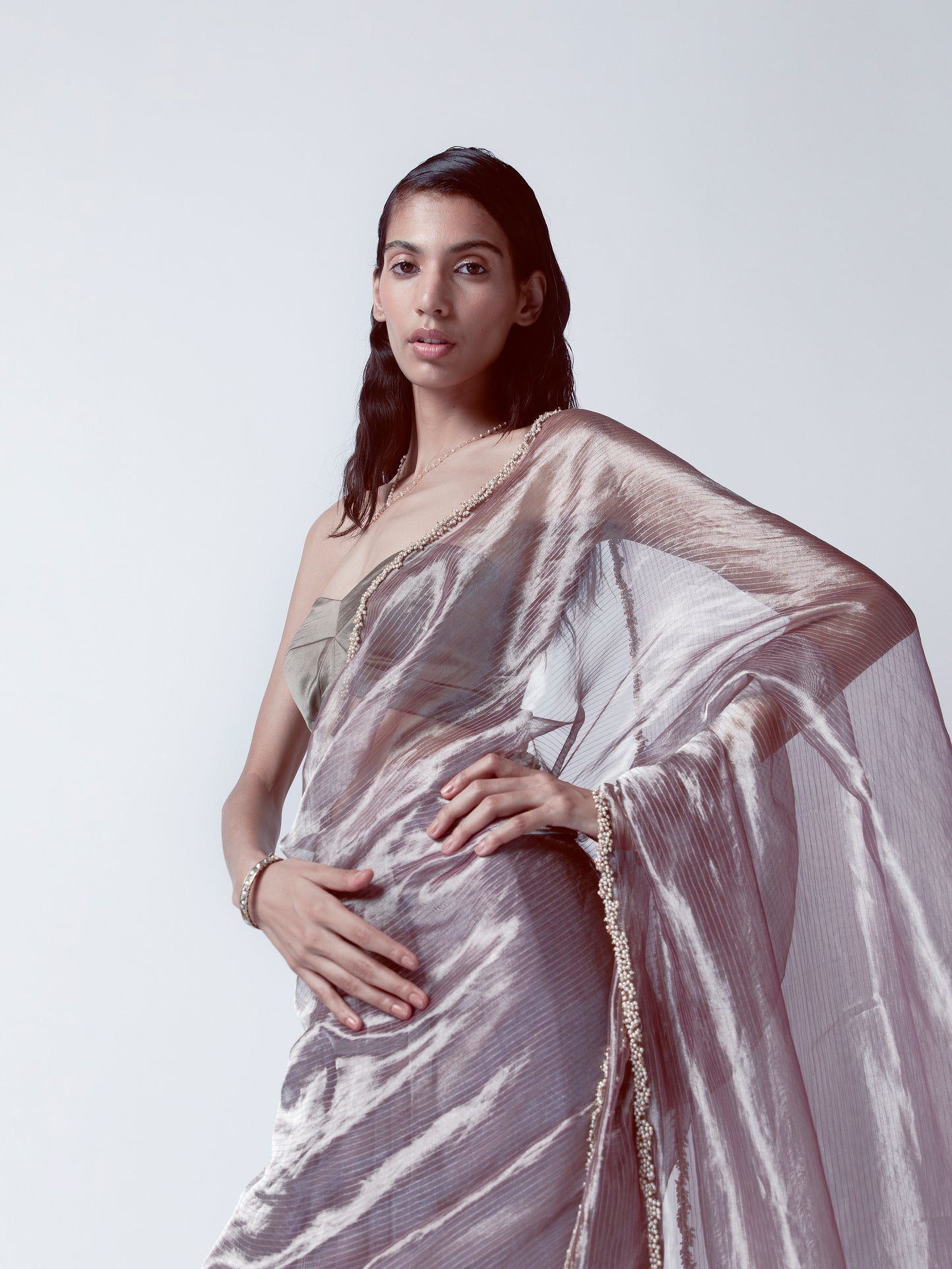 Blending versatility and drapability, this all-season Smoky Mauve Tissue saree features delicate hand-embroidery details lending a minimalist appeal for summer. Pair the lightweight tissue with a statement blouse and add a personal touch to your unique style.