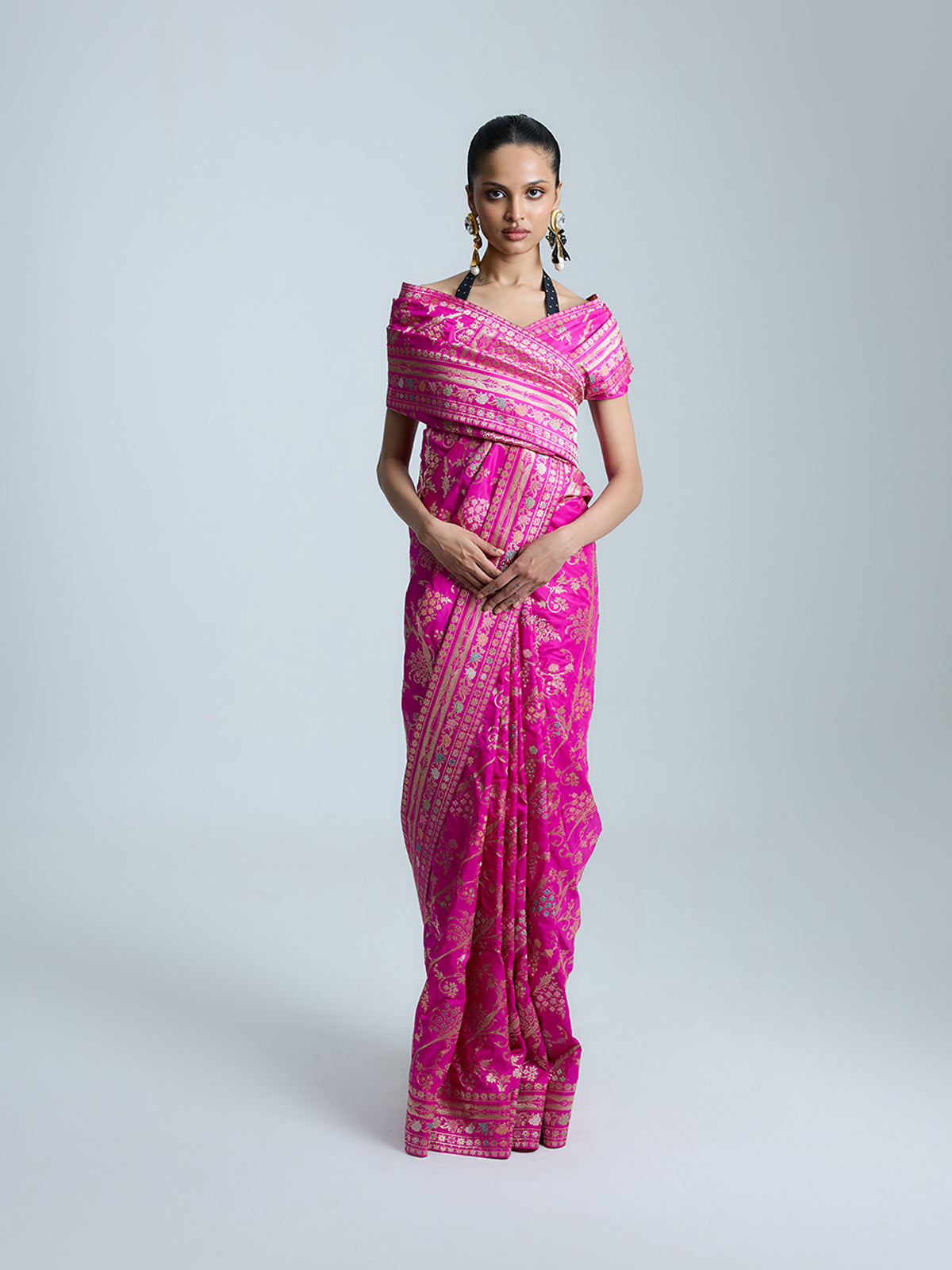 Bringing the beauty of Banarasi textiles to your festive wardrobe, our hot pink saree comes beautifully handwoven in silk using the Kadhwa technique. Pair it with a tonal bralette, and drape it sexy for an intimate Diwali dinner party.