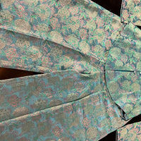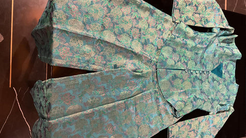 Celebrate festive moments in a jacket set that refuses to blend in. Handwoven in the Banarasi Tanchoi technique and crafted from sumptuous satin silk, this coral blue ensemble features a full-sleeve, button-down jacket paired with matching pants. Its refined texture, luxe drape, and intricate craftsmanship ensure all eyes are on you.