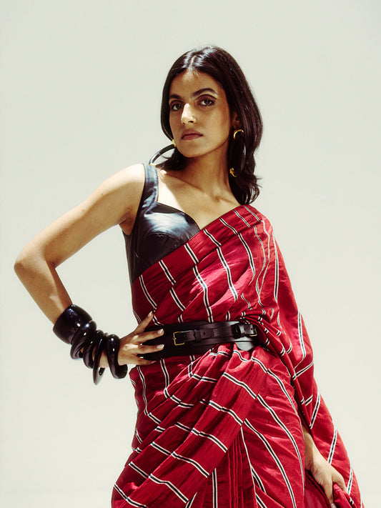 Handwoven Embroidered Vermillion Saree With Gold Button Detailing