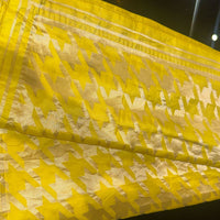 This yellow signature is handwoven in pure silk and comes sprinkled with intricate gold zari in a beautiful houndstooth pattern. We recommend styling it with a striking belt or, accessorizing with some statement gold jewellery to finish the look.