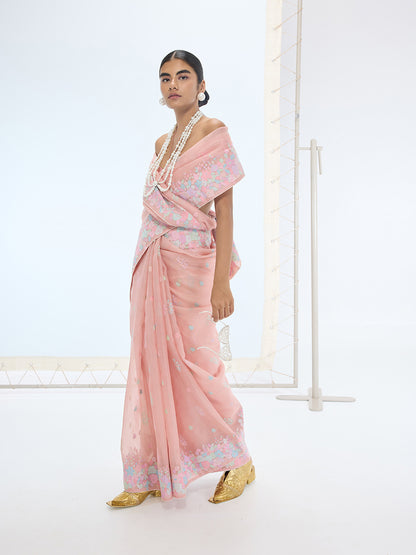 The Lexi Saree in a refreshing peach hue is meticulously handwoven over 400 hours in ethereal pure organza silk, using the intricate Kadhwa Banarasi technique. This extraordinary commitment to craft results in a saree that is lightweight, fluid, and drapes with effortless grace—offering soft movement and an airy touch against the skin.