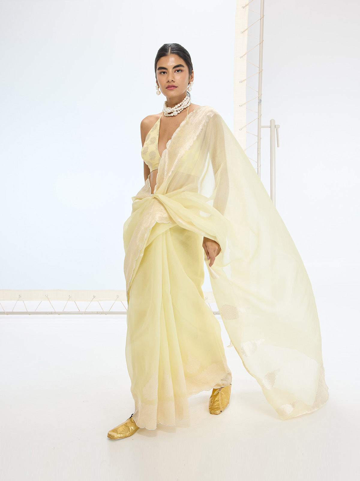 The Serena Saree in lemon yellow is handwoven in pure organza and features delicate hand embroidered detailing. Lightweight and fluid, this drapes beautifully and feels soft on the skin.