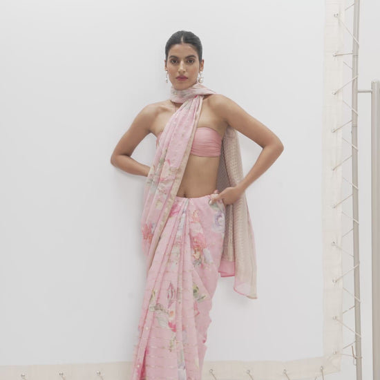 This ballet pink Banarasi saree features striking digital print all over, hand-finished in pure georgette. Made for women who move differently, it’s soft, fluid, and unapologetically bold.