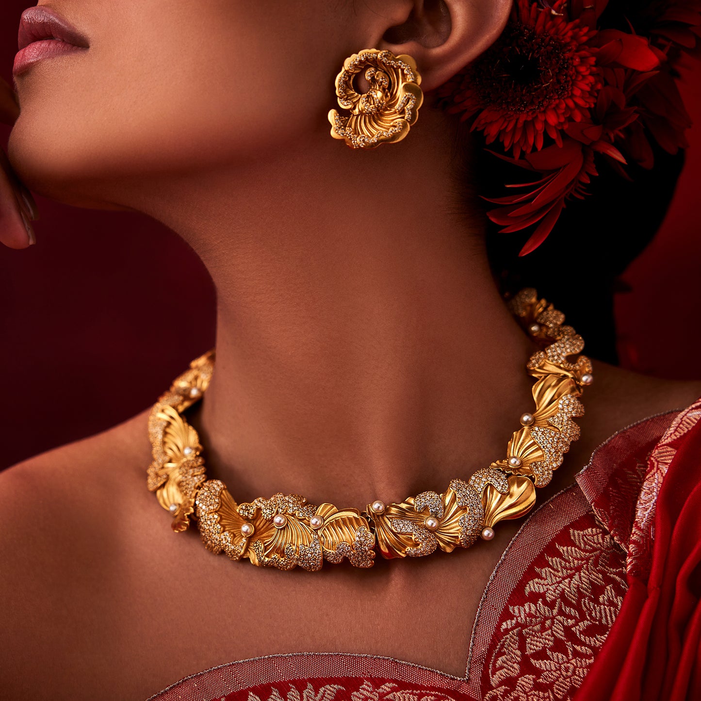 This ethereal choker features striking golden motifs studded with handpicked Morning Star and Pastel Plum stones. This neckpiece perfectly outlines the wearer's neck.