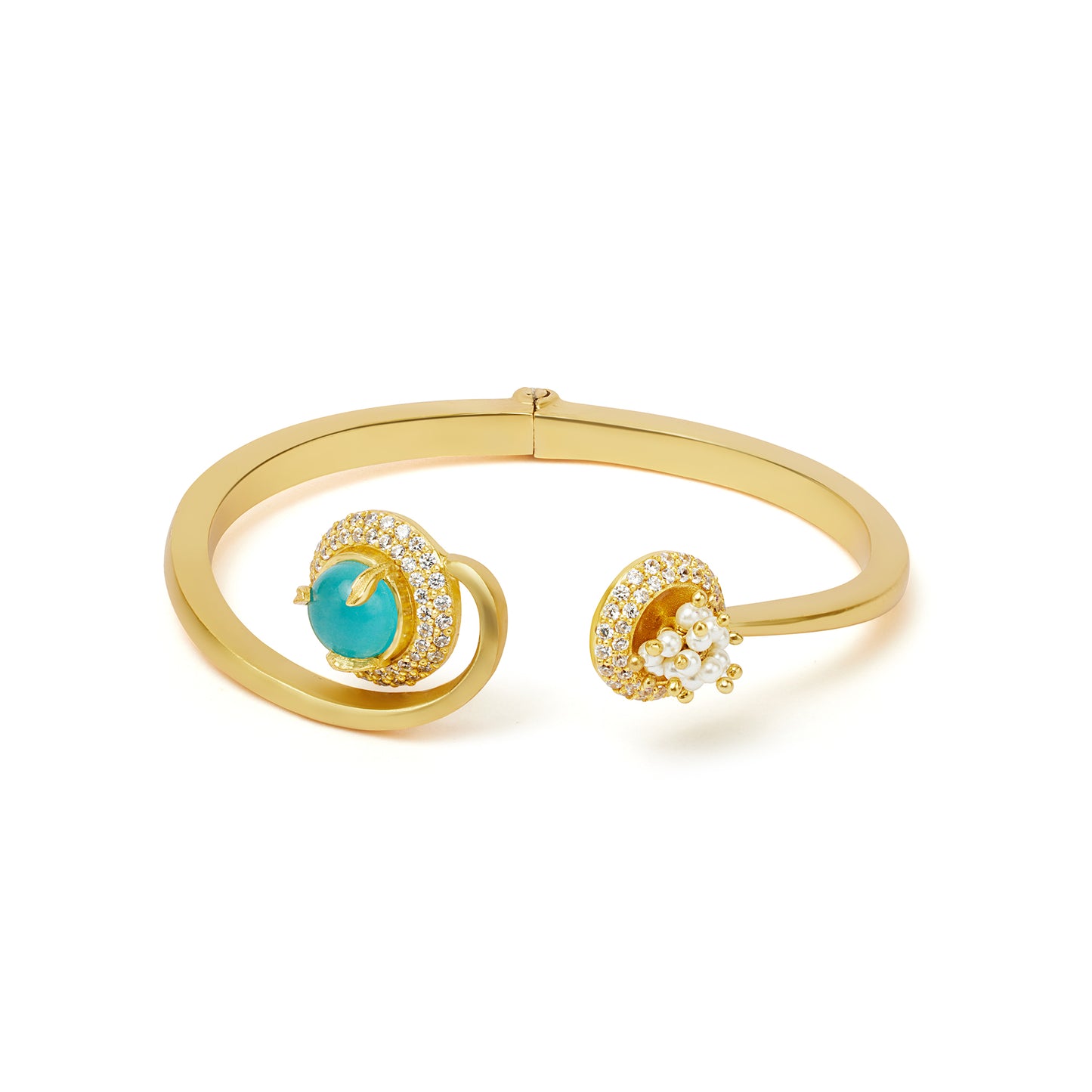 A stylish blend of classic and contemporary design vocabulary--this cuff is embellished with sparkling Morning Star and Pastel Plum stones, and a vibrant selection of Turquoise Crystals. Pair this with the Odeta Hasli necklace to complete your look.
