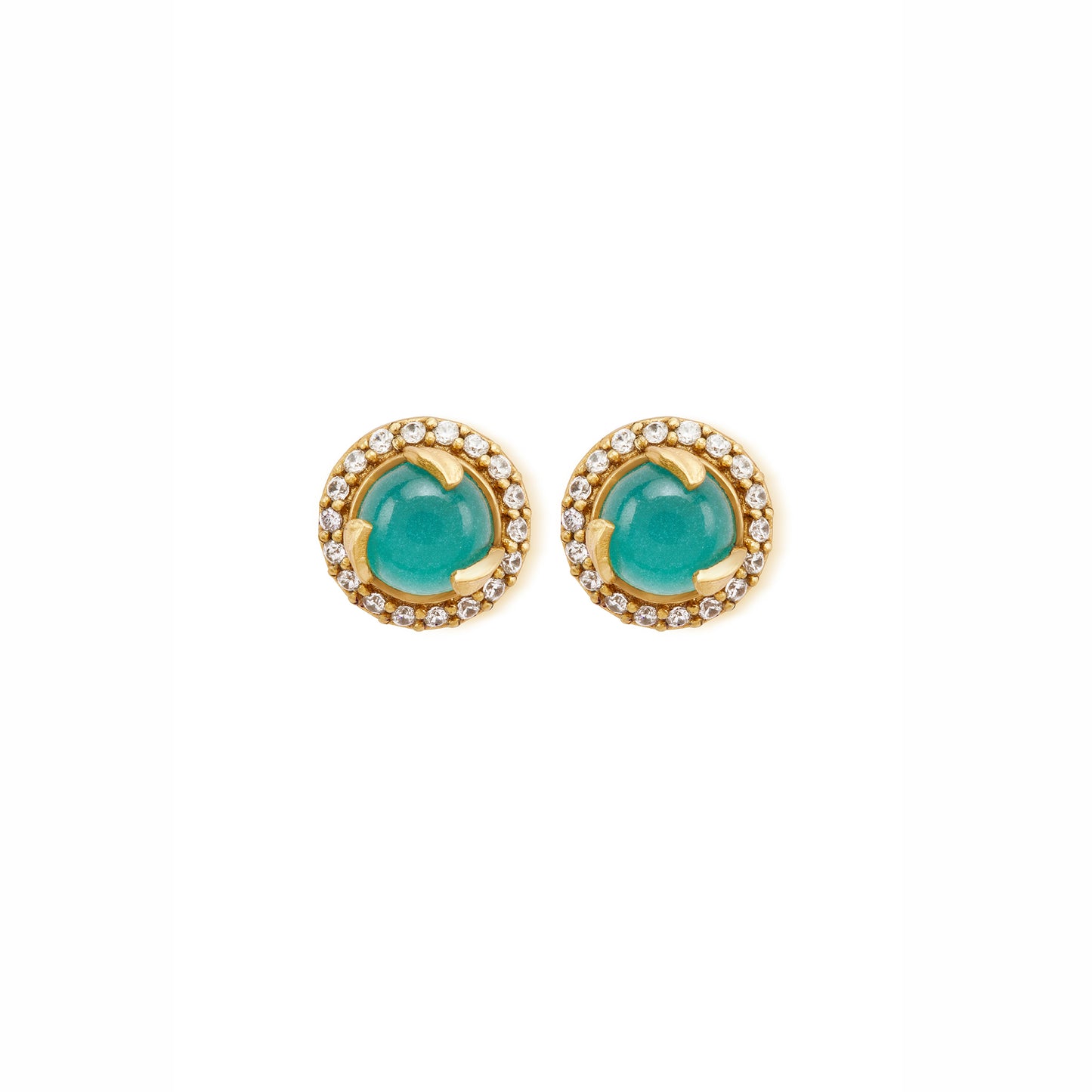 This bold earring features a classic Turquoise Crystal accompanied by a carved golden base speckled with luminous Morning Star stones. These can also be detached and worn as simple aquamarine studs.