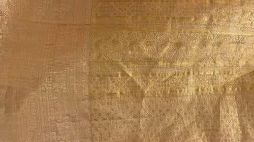 This handwoven mustard Kanjivaram saree, crafted in pure silk, is a true collector’s piece. It carries a soft, luminous sheen that beautifully enhances the fabric.