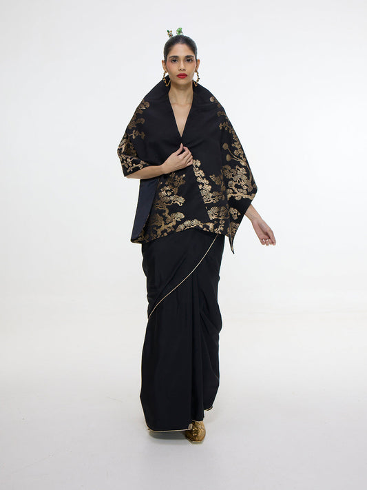 Handwoven Black Mashroo Silk Saree With Gold Button Detailing
