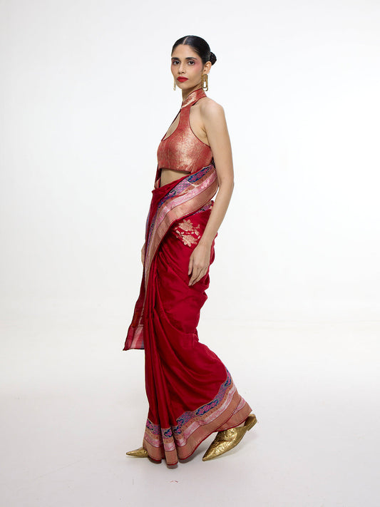 Handwoven Embroidered Vermillion Saree With Gold Button Detailing
