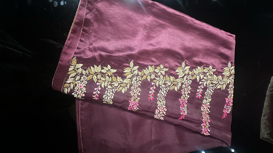 Step into festive celebrations with a saree that truly stands out. Handwoven in pure mashroo silk, this piece features intricate embroidery  at the pallu inspired by Oriental motifs. Its versatile drape allows for multiple styling options.