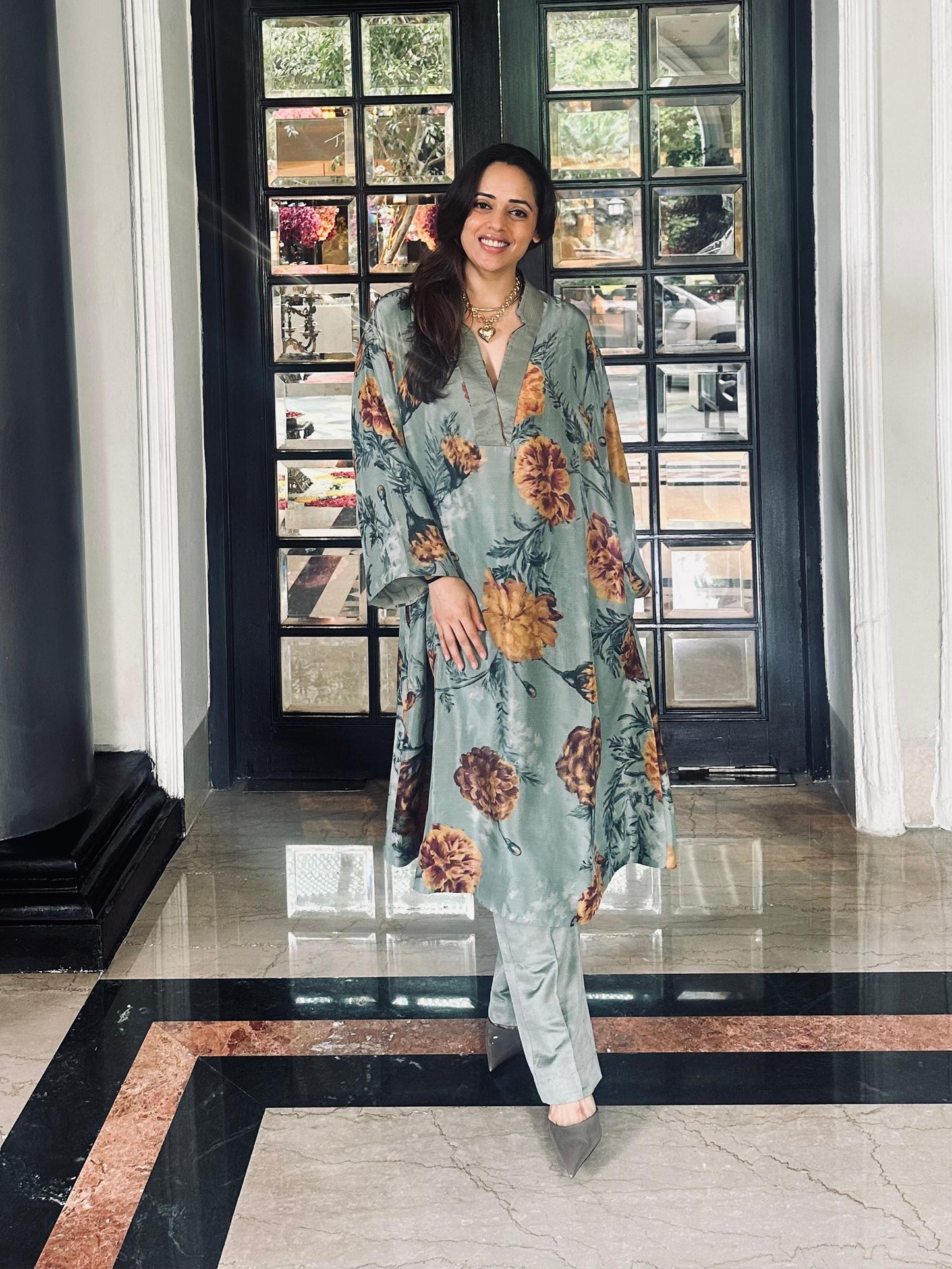 Mint Green Printed Kurta set handwoven in silk featuring scattered printed florals. Tailored to a relaxed fit, the breezy kurta is paired with a pant and offers comfort and ease, perfect for summer’s and beyond.