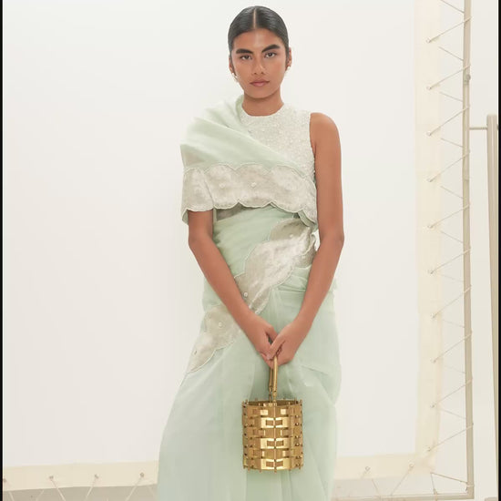 The Jane Saree in sea green is handwoven in pure organza, adorned with intricate pure silver zari beading and finished with elegant scalloped edges. Lightweight and fluid, this saree drapes effortlessly, offering graceful movement and a soft, ethereal touch against the skin.