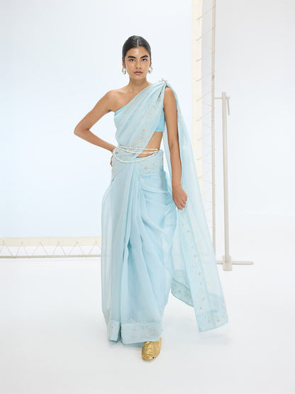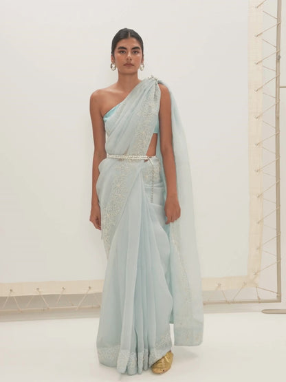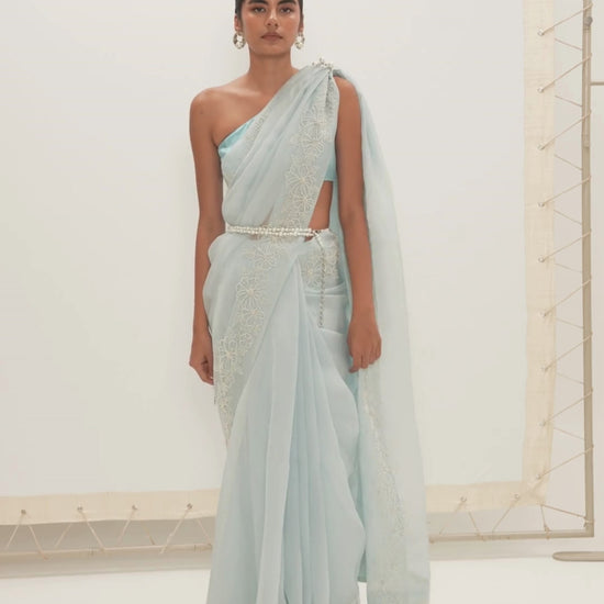 The Luna Saree in aqua green is handwoven in pure organza and features delicate hand embroidered detailing. Lightweight and fluid, this drapess beautifully and feels soft on the skin.
