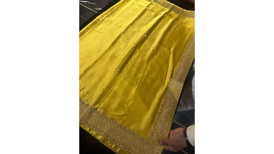 Crafted from the softest, most fluid satin silk, this yellow masterpiece features intricate embroidery inspired by Oriental motifs, allowing for endless styling possibilities.