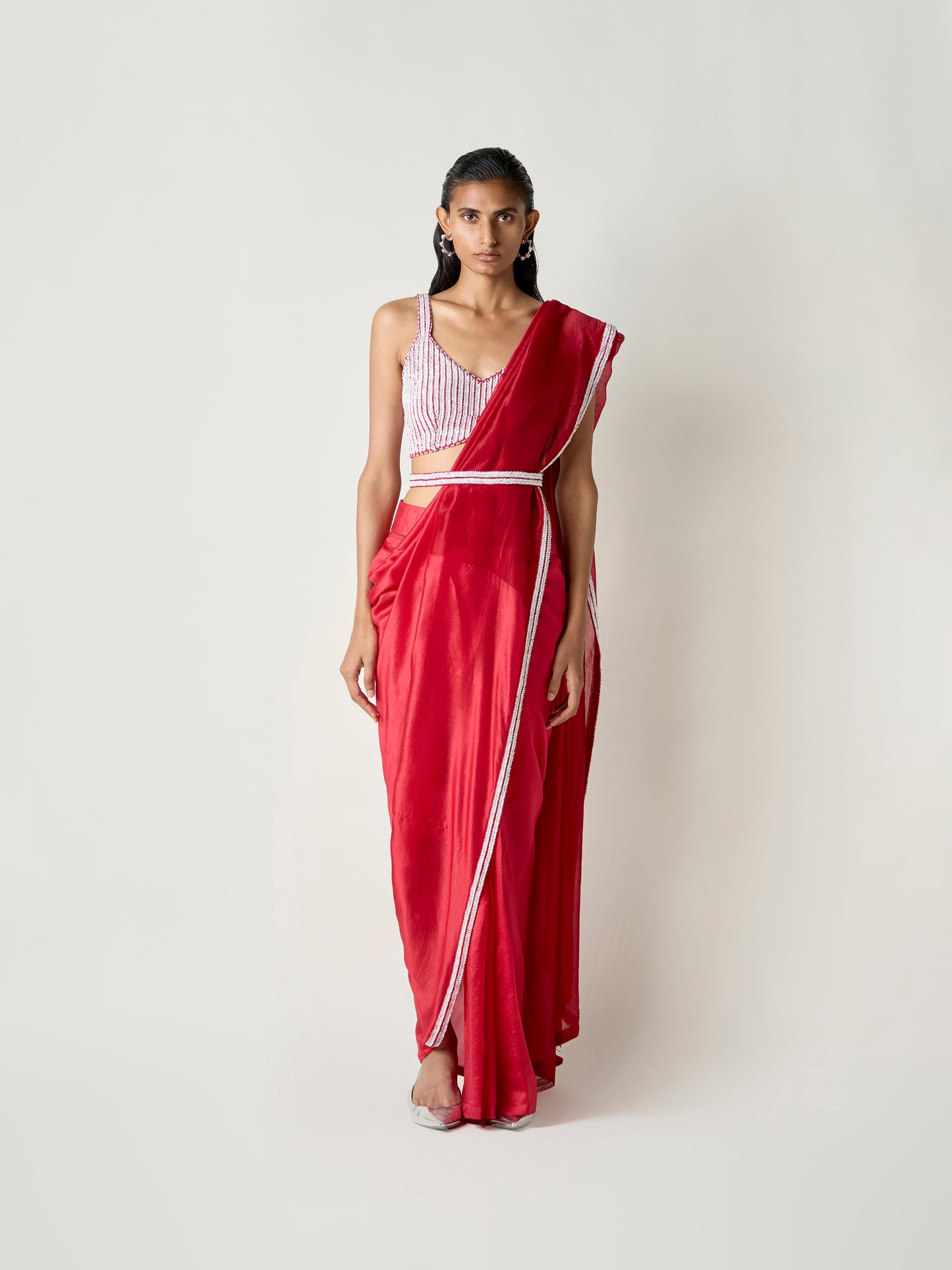 Meticulously handcrafted with intricate details, this thoughtfully embellished accessory can easily transform the silhouette of your ensemble, adding an effortless edge. To create a signature look, pair it with our pre-draped sarees.