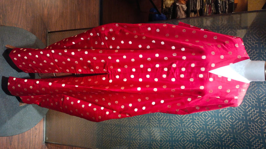 This red kaftan is handwoven in Cutwork Banarasi technique and crafted in satin-silk. Cut in a fluid global silhouette, it features a V-neckline, kimono sleeves and deep front slit.