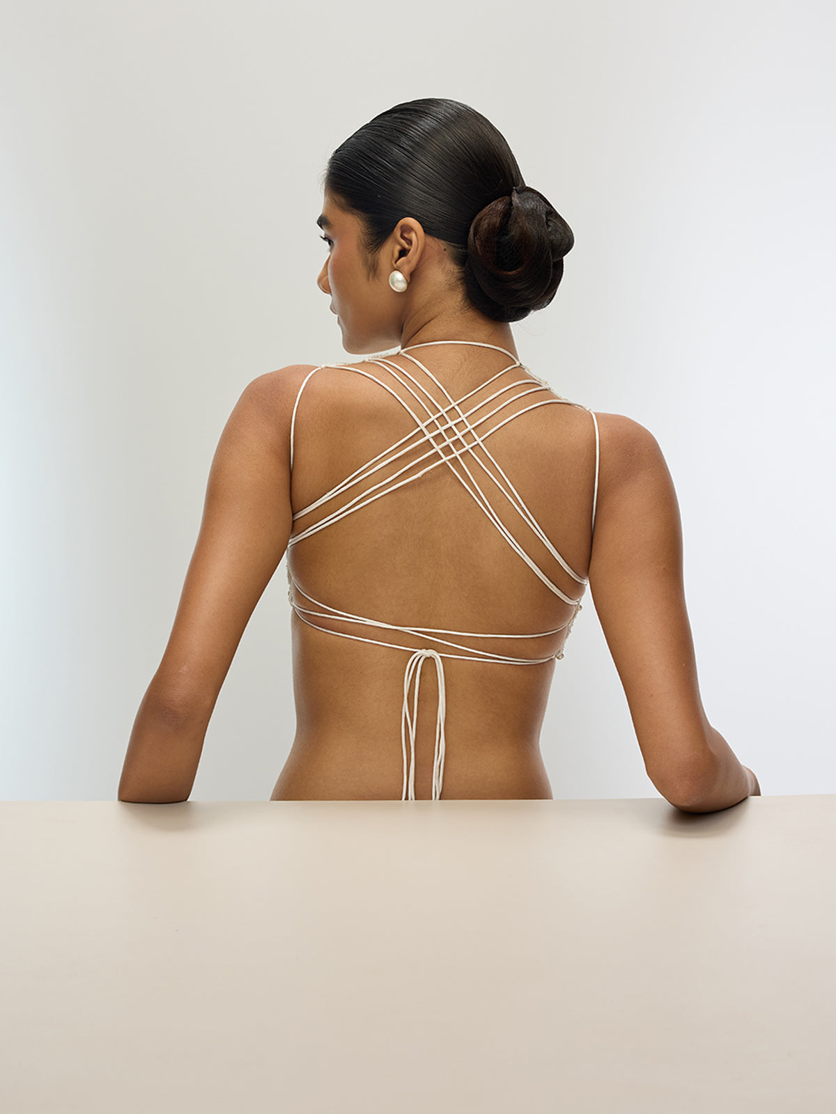 Handwoven in pure Banarasi silk, this ivory blouse features a graceful high neckline, and intricate pearl detailing. Sculpted yet soft, it’s thoughtfully tailored to offer a polished silhouette that feels as effortless as it looks refined.