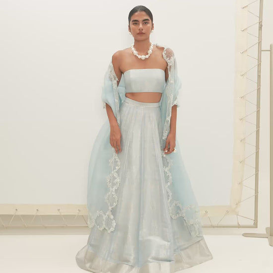 The Liza Lehenga Set in refreshing aqua blue is handwoven in luxurious pure Katan silk, using the intricate Jaaldar Kadua Hunar technique—a true testament to timeless craft. Lightweight and fluid, this ensemble drapes effortlessly, offering grace, movement, and a soft touch against the skin.