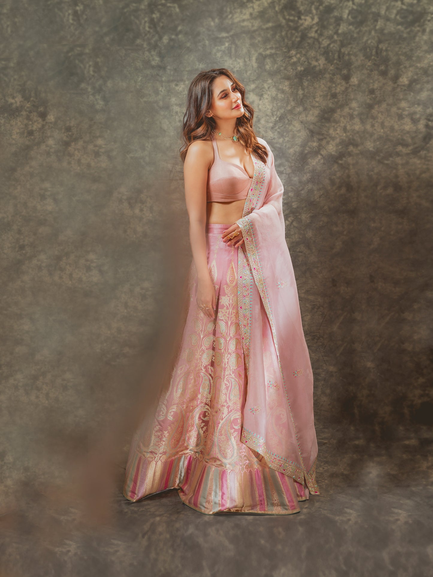 Nikita Dutta in Handwoven Blush Pink Silk Lehenga