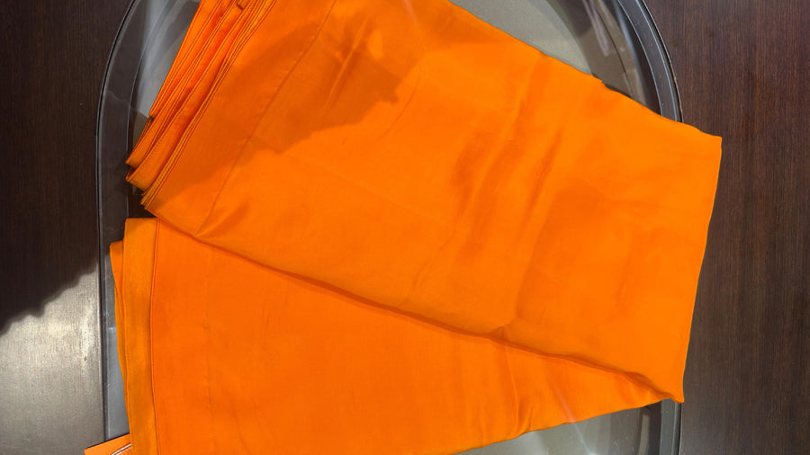 An easy to drape, transeasonal sari in tangerine orange that can seamlessly flow from your everyday outfitting to evenings of celebration. Play up the lightweight Organza with a statement blouse or a tonal cape for a striking ensemble that commands attention. The sari comes with unstitched blouse fabric. To purchase the blouse as seen on the model, or any other customisations, please get in touch with our style advisors at +91 95606 50774.