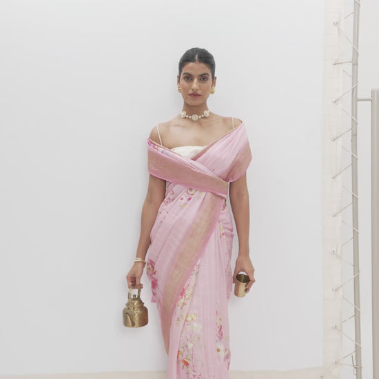 This ballet pink Banarasi saree features striking digital print all over, hand-finished in pure georgette. Made for women who move differently, it’s soft, fluid, and unapologetically bold.