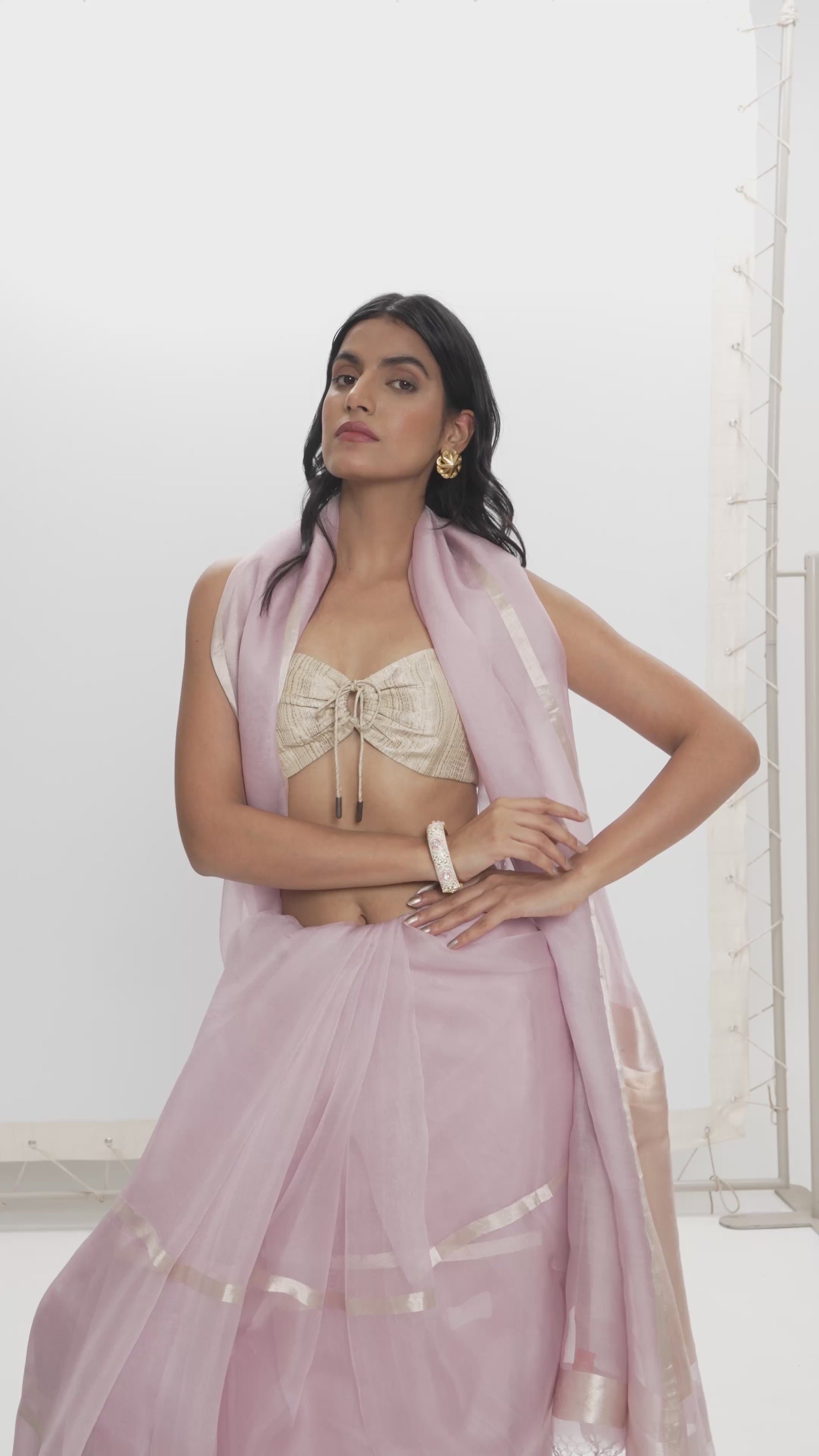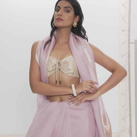 This mauve organza silk saree features a bold solid zari border that adds structure and shine to its airy silhouette. Sheer, soft, and surprisingly easy to wear, it’s where minimal design meets maximum elegance.