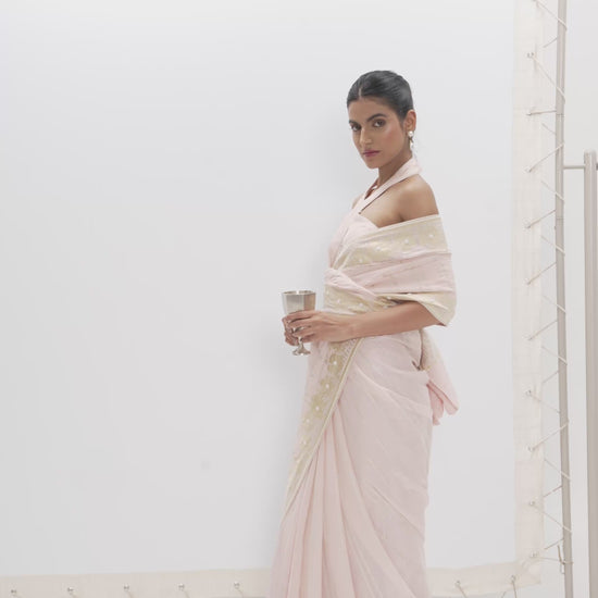 This peach pink Banarasi saree is handwoven in pure georgette using the Kadhwa technique, with delicate hand embroidery adding an extra layer of detail. Soft, lightweight, and endlessly versatile, it brings together heirloom craftsmanship and modern ease.