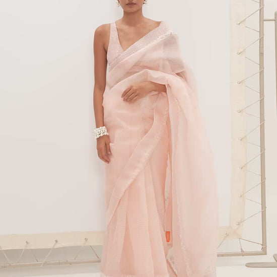 The Stella Saree in peach is handwoven in pure organza with resham stripes. Lightweight and fluid, this drapess beautifully and feels soft on the skin.