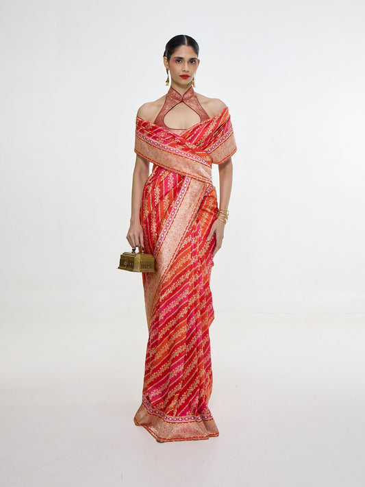 Handwoven Embroidered Vermillion Saree With Gold Button Detailing