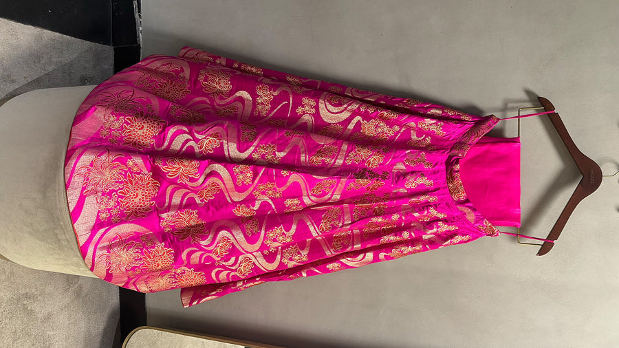 Make a statement this wedding season in our handwoven cutwork Banarasi lehenga, crafted in luxurious pure satin silk. In a regal fuchsia pink colour, it features intricate motifs inspired by Oriental culture, while the blouse showcases a halter neckline with striking cut details.