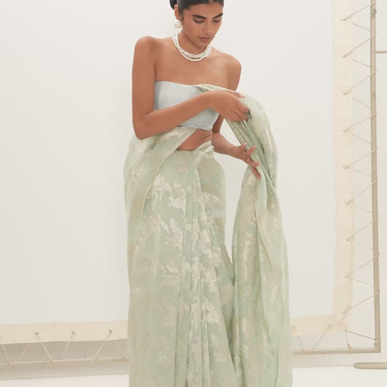 The Diana Saree in aqua green colour is handwoven in pure organza silk using the silver floral jaal technique. Lightweight and fluid, this drapess beautifully and feels soft on the skin.