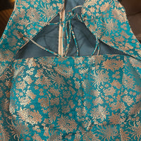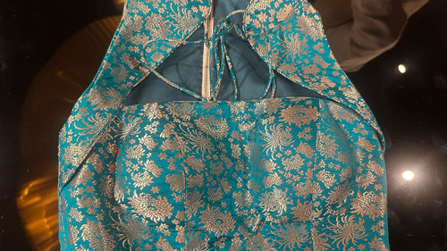 The Coral Blue blouse is handwoven in pure satin using the Kadhwa Banarasi technique. Featuring a square neckline with a mandarin collar and tie-up detail, its intriguing cut makes it a statement piece on its own.