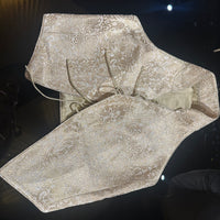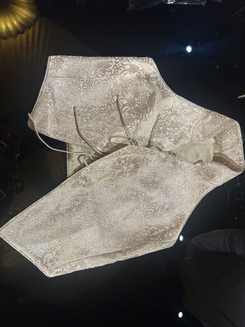 The Ivory-Gold Blouse is handwoven in pure silk using the Kadhwa Banarasi technique. Featuring asymmetric waistcoat-like flaps with tie-up detailing and a mandarin collar, it’s a modern twist on traditional craftsmanship.