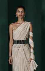 An easy to drape, transeasonal sari in champagne beige that can seamlessly flow from your everyday outfitting to evenings of celebration. Play up the lightweight silk with a statement blouse or a tonal cape for a striking ensemble that commands attention. The sari comes with unstitched blouse fabric. To purchase the blouse as seen on the model, or any other customisations, please get in touch with our style advisors at +91 95606 50774.