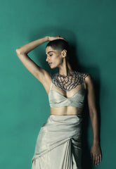 An easy to drape, transeasonal sari in dove grey that can seamlessly flow from your everyday outfitting to evenings of celebration. Play up the lightweight Organza with a statement blouse or a tonal cape for a striking ensemble that commands attention. The sari comes with unstitched blouse fabric. To purchase the blouse as seen on the model, or any other customisations, please get in touch with our style advisors at +91 95606 50774.