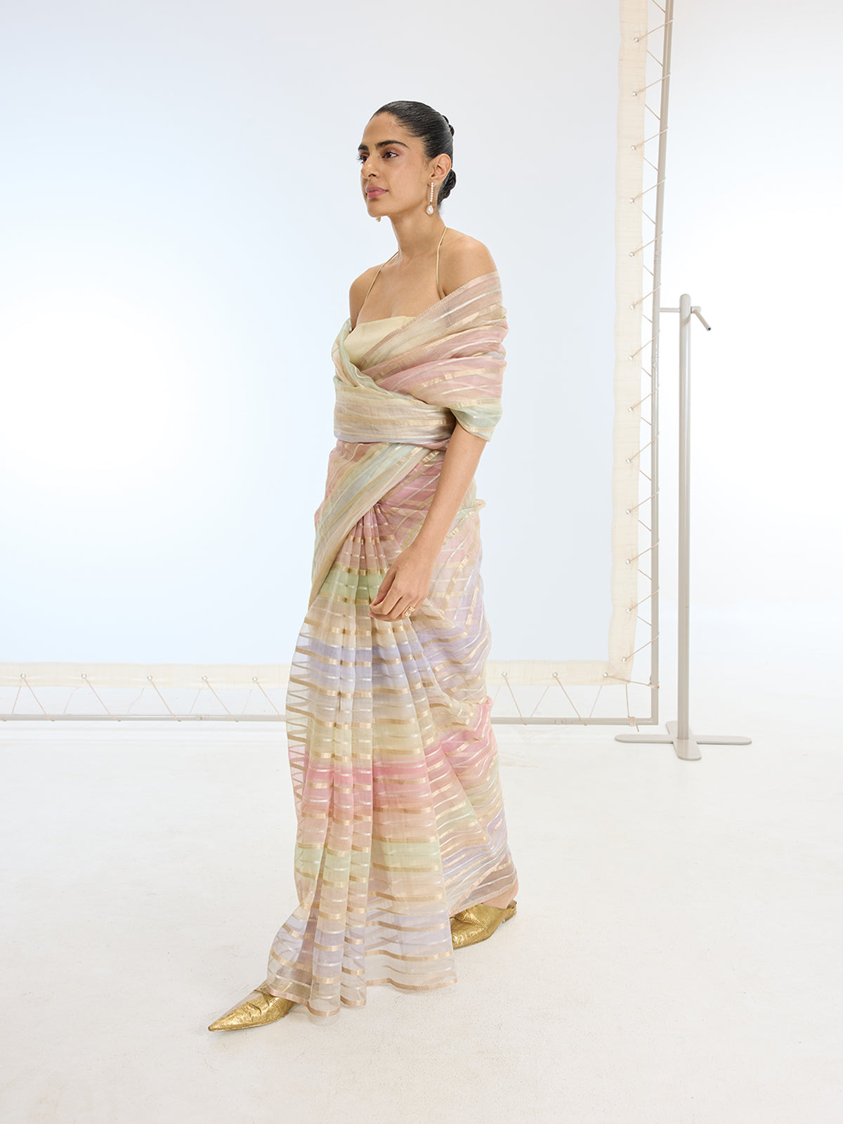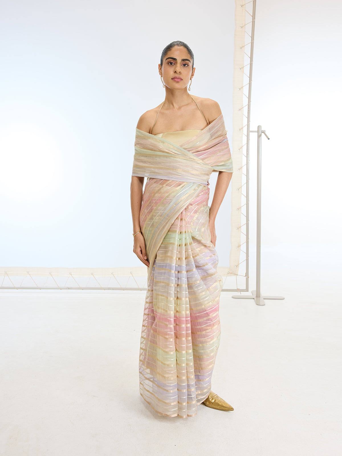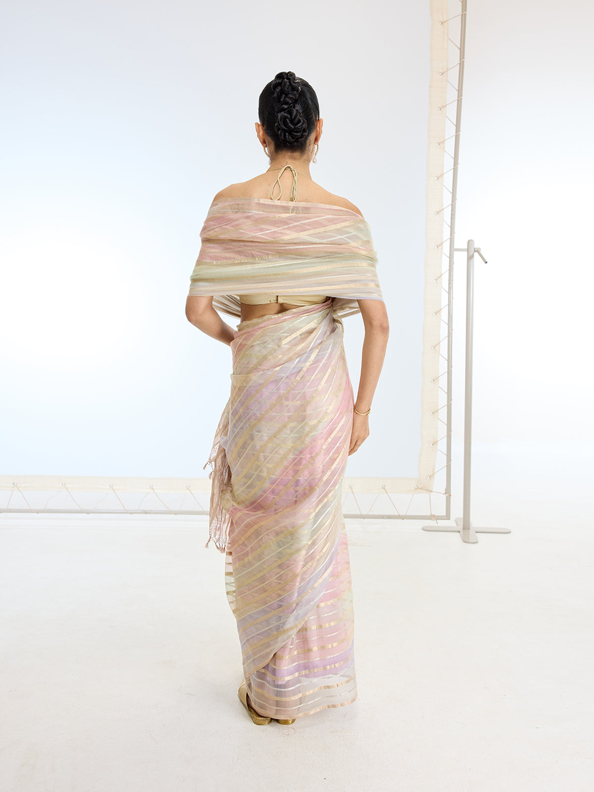 Saree pleats are neatly stitched in place for quick and easy draping.