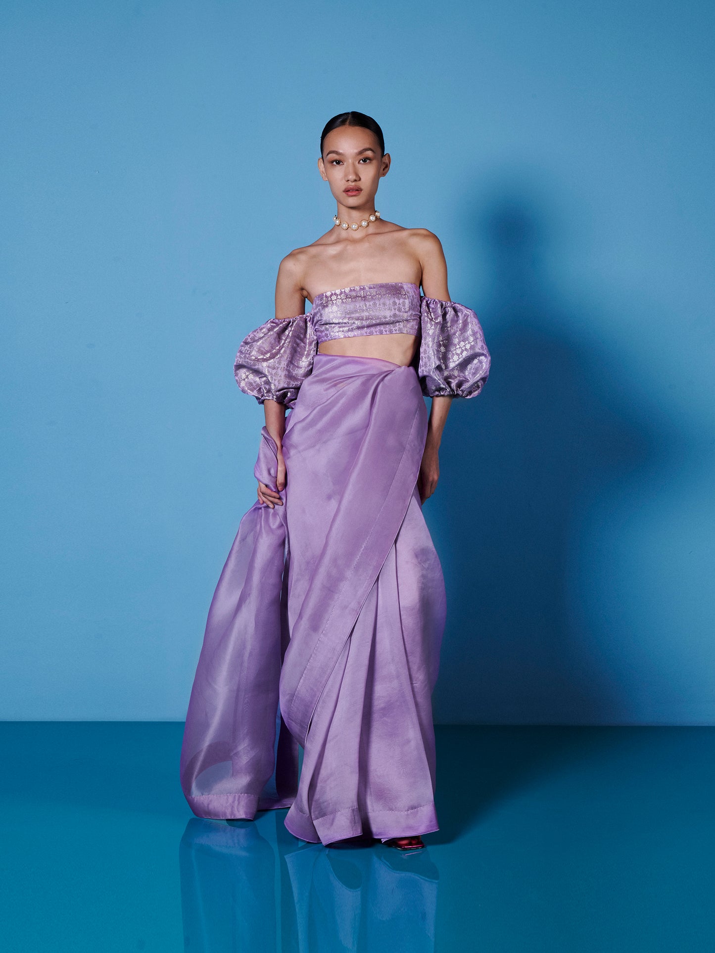 An easy to drape, transeasonal sari in orchid violet that can seamlessly flow from your everyday outfitting to evenings of celebration. Play up the lightweight Organza with a statement blouse or a tonal cape for a striking ensemble that commands attention. The sari comes with unstitched blouse fabric. To purchase the blouse as seen on the model, or any other customisations, please get in touch with our style advisors at +91 95606 50774.