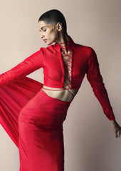 An easy to drape, transeasonal saree in ruby red that can seamlessly flow from your everyday outfitting to evenings of celebration. Play up the lightweight silk with a statement blouse or a tonal cape for a striking ensemble that commands attention. The saree comes with unstitched blouse fabric. To purchase the blouse as seen on the model, or any other customisations, please get in touch with our style advisors at +91 95606 50774.
