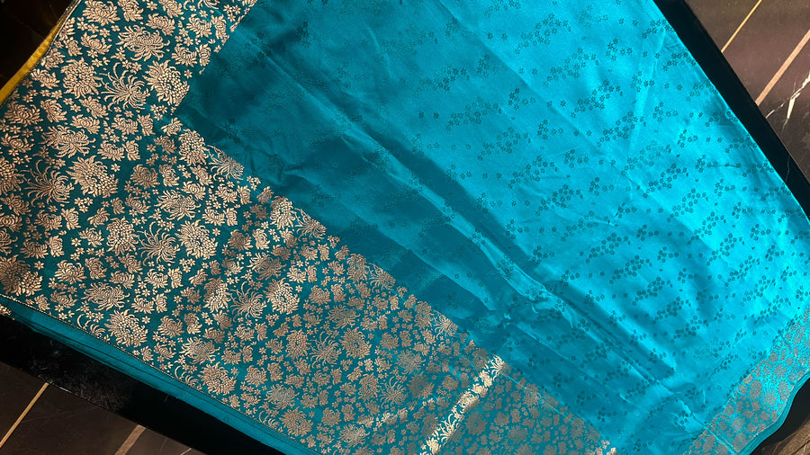 Handwoven in Banarasi Tanchoi and crafted from pure satin silk, this is one of the most drapeable, fluid sarees we’ve created—offering endless styling possibilities. Pair it with the matching blouse, featuring a mandarin collar and tie-up detailing to elevate your look.