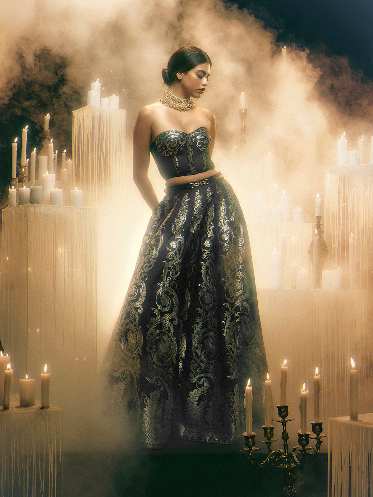 Our black handwoven lehenga set from Ekaya's fall/winter bridal collection  is crafted in pure silk using the Kadwa Banarasi technique and comes heavily laced with intricate gold detailing. We recommend matching the regal beauty of the lehenga with some heritage jewellery to complete the look.