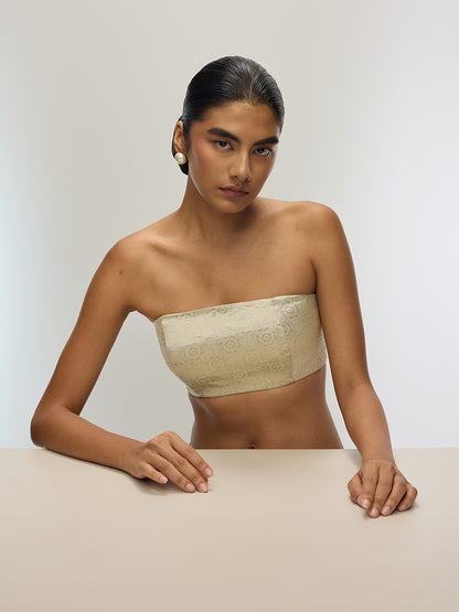 Handwoven in pure Banarasi silk, this delicate pistachio green bandeau blouse is a contemporary take on traditional occasionwear. Clean-lined, minimal, and thoughtfully structured, it offers a refined silhouette with effortless ease.