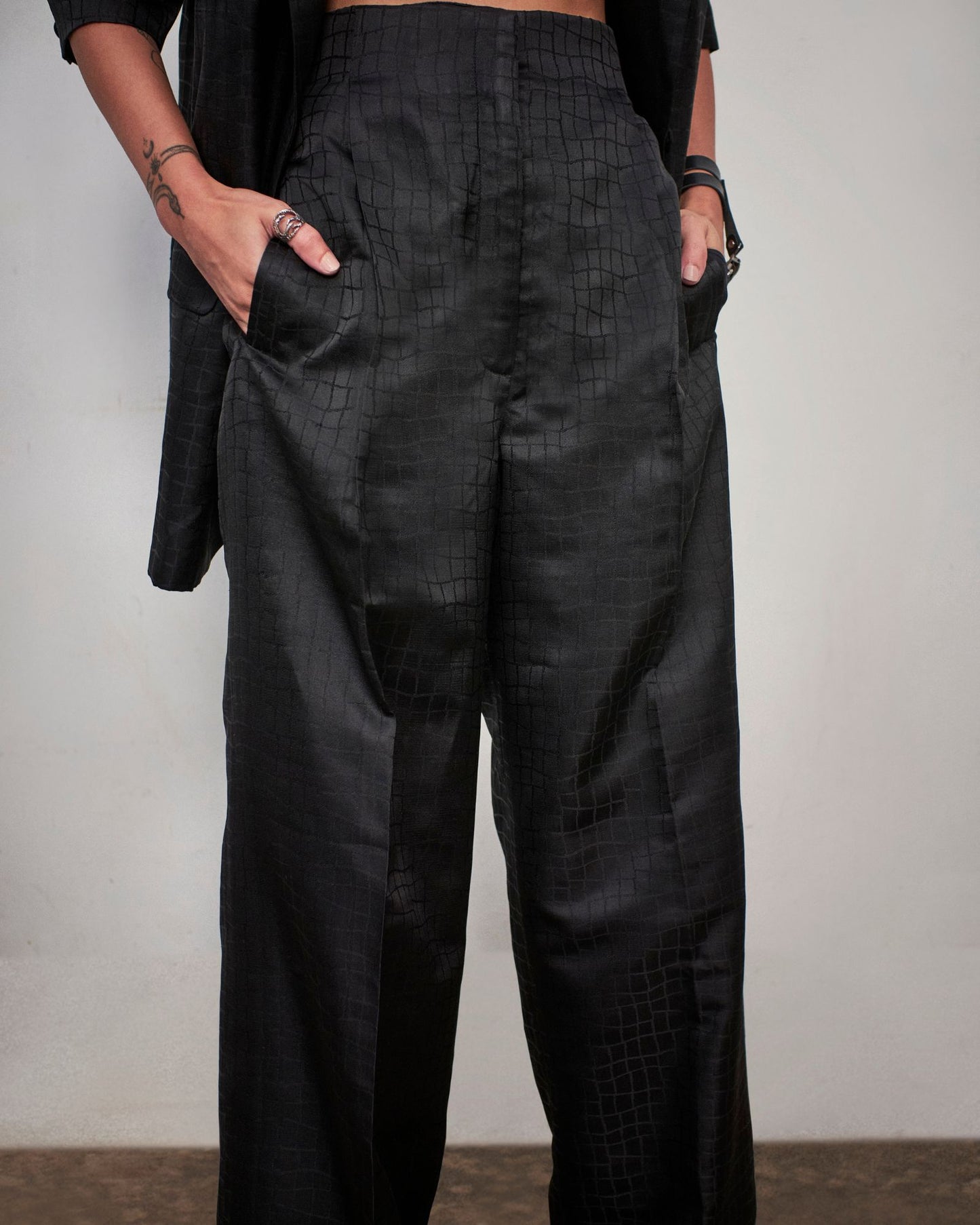 A contemporary update on the classic pantsuit, this piece is tailored in traditional Banarasi weaves, with crisp details and finishings that stylishly elevate its oversized silhouette.