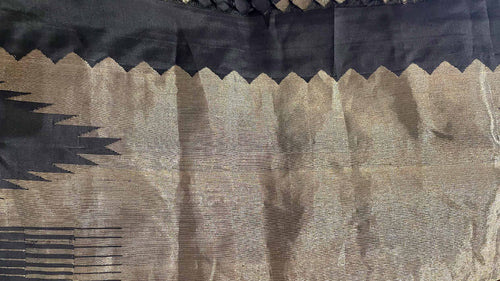 This handwoven black Kanjivaram saree, crafted in pure silk, is a true collector’s piece. Detailed with lustrous gold motifs throughout, it balances the richness of traditional craftsmanship with a fresh lens.