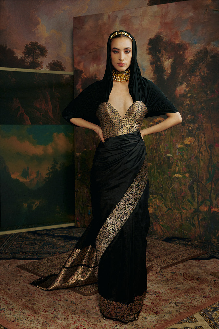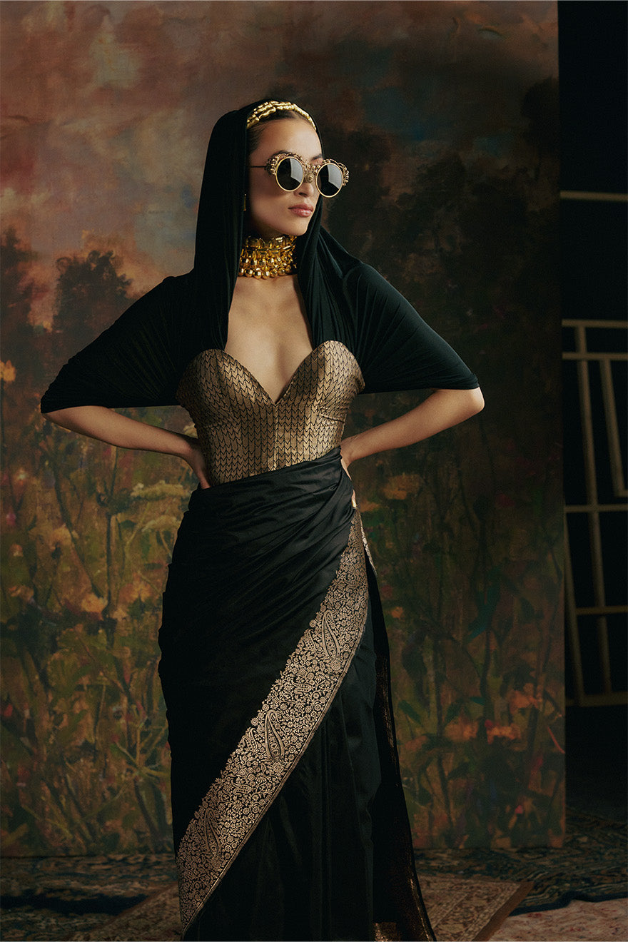 Saree pleats are neatly stitched in place for quick and easy draping.