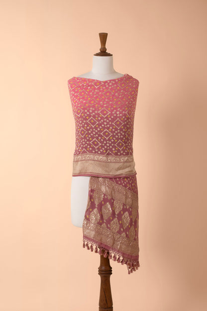 This Handwoven pink bandhani dupatta displays a combination of a beautiful colour pallete and exquisite craft. 200 hours of intricate banarasi cutwork by our skilled craftsmen, makes this a piece that'll light-up any ensemble.