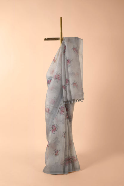 Our handwoven grey digital print organza sari features designs inspired from the traditional sari design with beautiful printed border, reimagined and designed for the modern wearer. The sari comes with the unstitched blouse fabric.