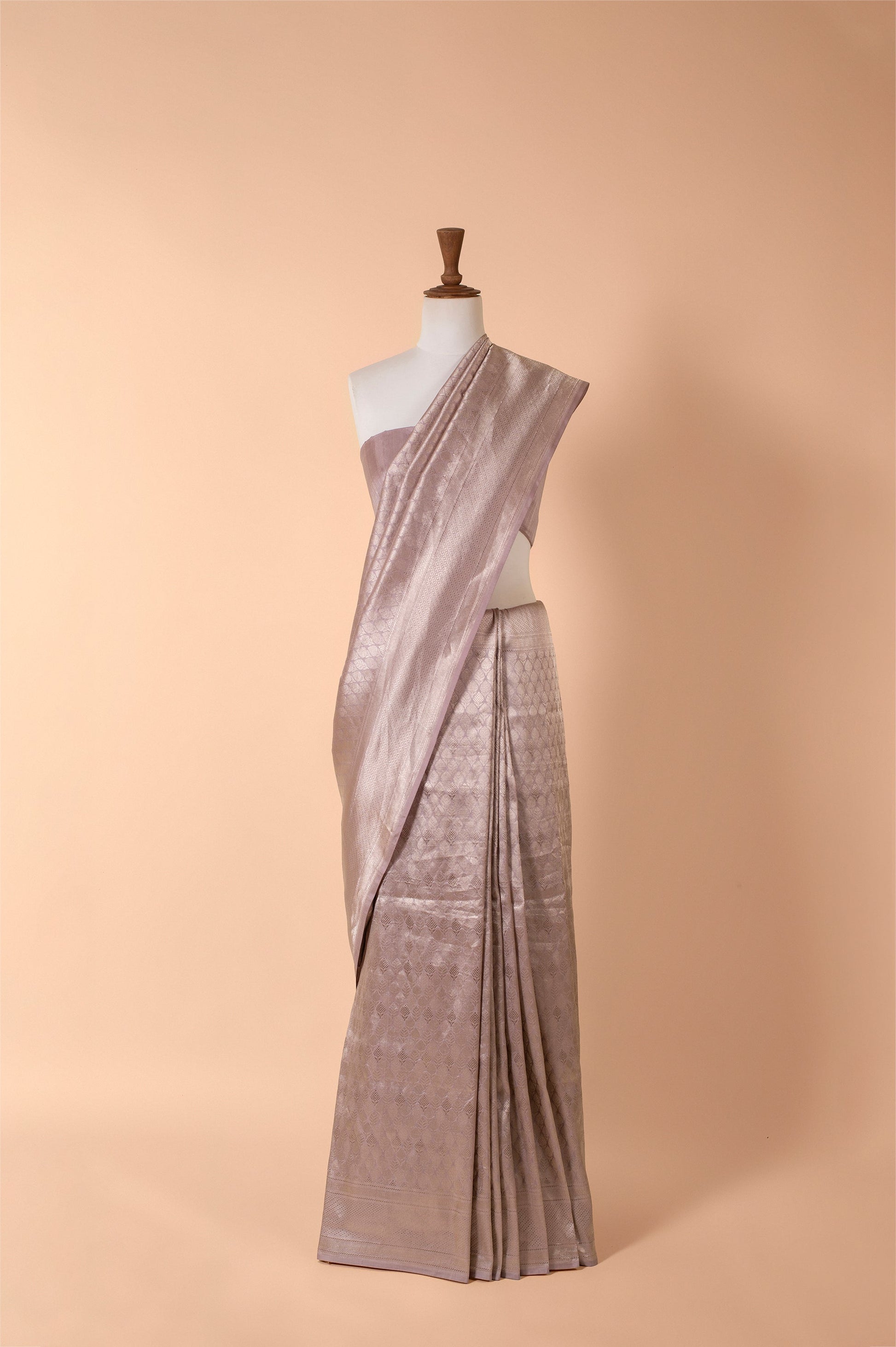 This handwoven mauve silk sari is a must-have piece for the wardrobe. Perfect for summer, meticulously handwoven with banarasi kadwa technique, it is a fine pick for festivals. It comes with an unstitched blouse.