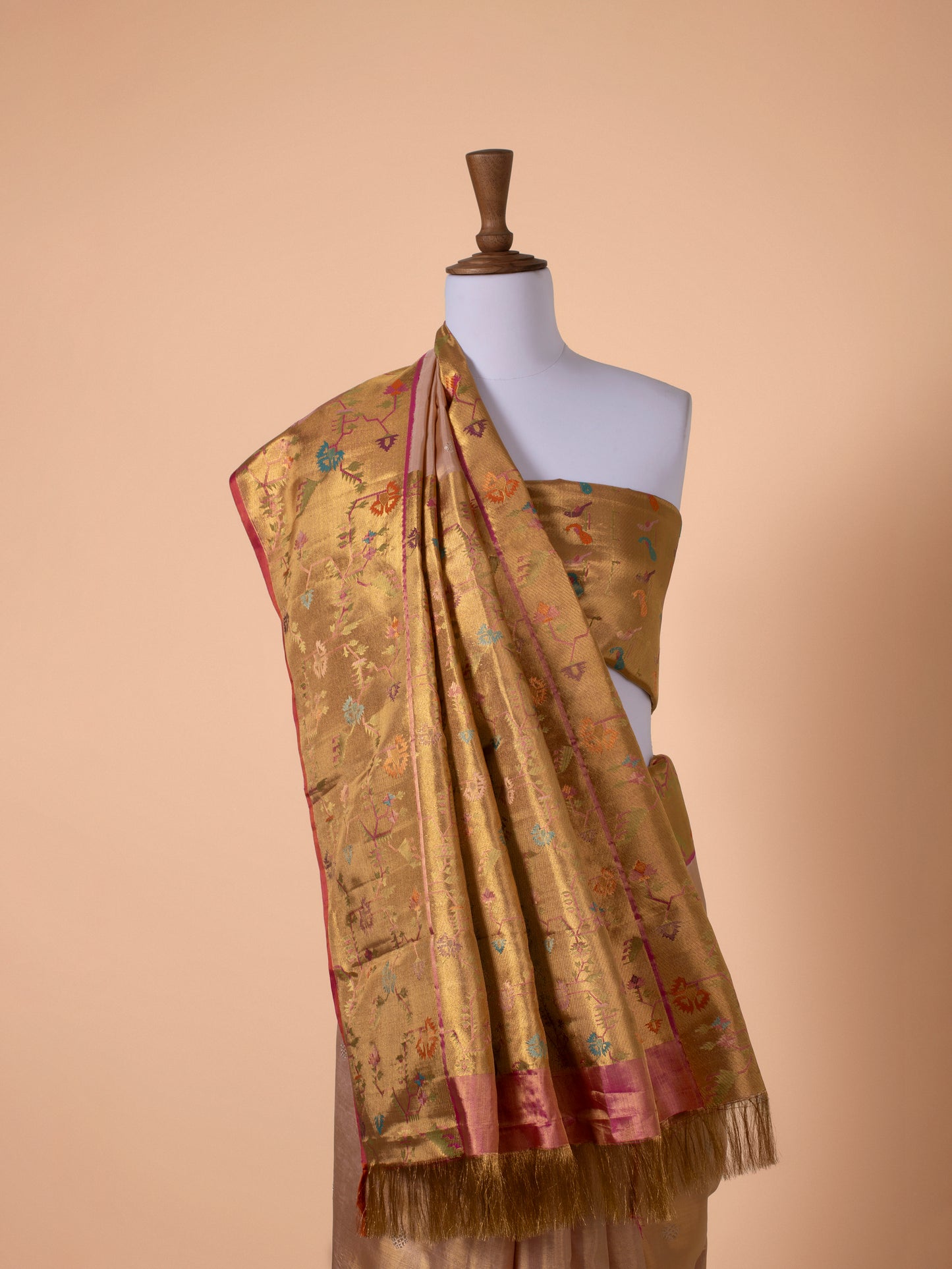 Ekaya’s Handwoven Peach Silk Kanjivaram Saree is a true testament to the skill and artistry of traditional weavers. Woven intricately from the finest silk and the richest of zari, it features the traditional Banarasi Kadhwa technique all-over. ‘Kadhwa’ is an age-old mathematically precise brocade weaving technique that can only be undertaken by experts. The saree has been entirely hand-woven with an exceptional rich texture and vibrant colour, taking over 900 man-hours. The lustrous sheen of a Kanjivaram makes it a must-have collectible for your textile wardrobe. Perfect for a bride, special occasions and grand celebrations.